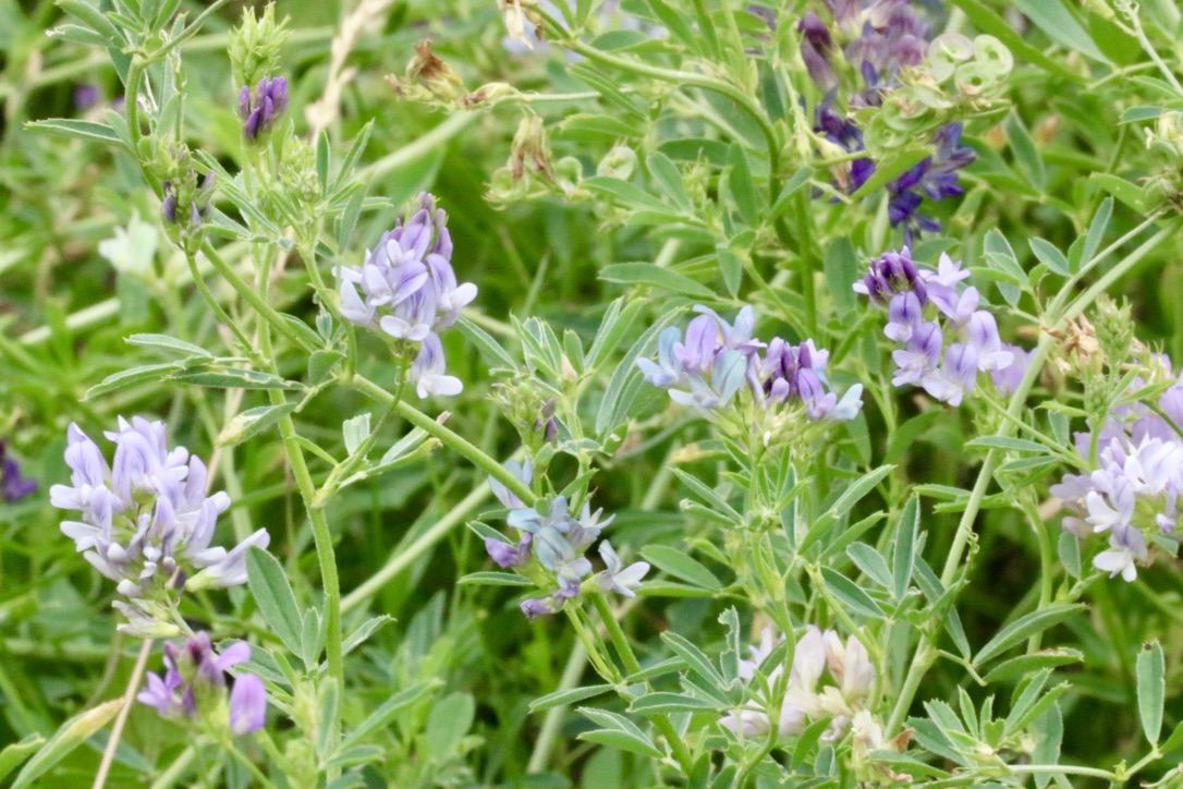 I have one more interesting tidbit to share before I let you all go for this month: Medicago sativa shares a close cousin, Medicago sativa spp. falcata. M. s. falcata is called “Yellow-flowered alfalfa” or “Siberian alfalfa.” It has much smaller trifoliate leaves than M. sativa, and all flowers are a bright yellow. Not as common as its Common Alfalfa brethren, but it’s tougher in that it can grow in some areas where M. sativa won’t. It’s become naturalized in northern Alberta, British Columbia and Saskatchewan and remains a productive (bloat-reduced) forage plant for hay and grazing.