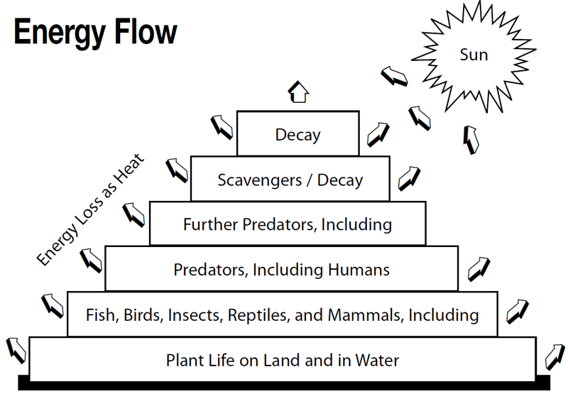 The traditional energy pyramid, as shown above, displays how energy flows upwards at various trophic levels. Plants are the first and bottom level, and decay is the final (top) level. In between is the function of life feeding upon each other, from herbivores to apex predators, including humans.