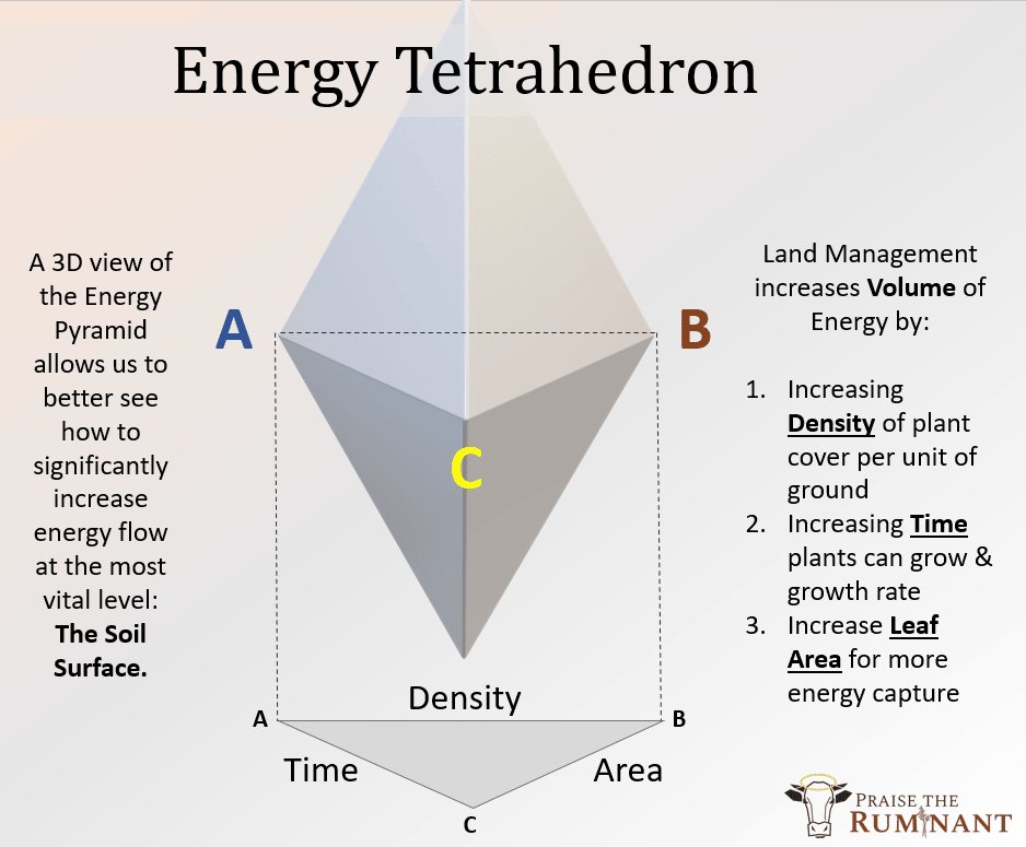 The energy tetrahedron is a new way of looking at the energy pyramid. The tetrahedron changes our view from the 2D “triangle,” where all we see is how energy is lost, to the 3D pyramid (or tetrahedron) that shows us the volume of energy produced for the life of this planet by plants. It still acknowledges that energy is being lost, but it’s a drastic change in perception because now we can see just how management increases or decreases the base (or middle) of the shape by three significant factors: