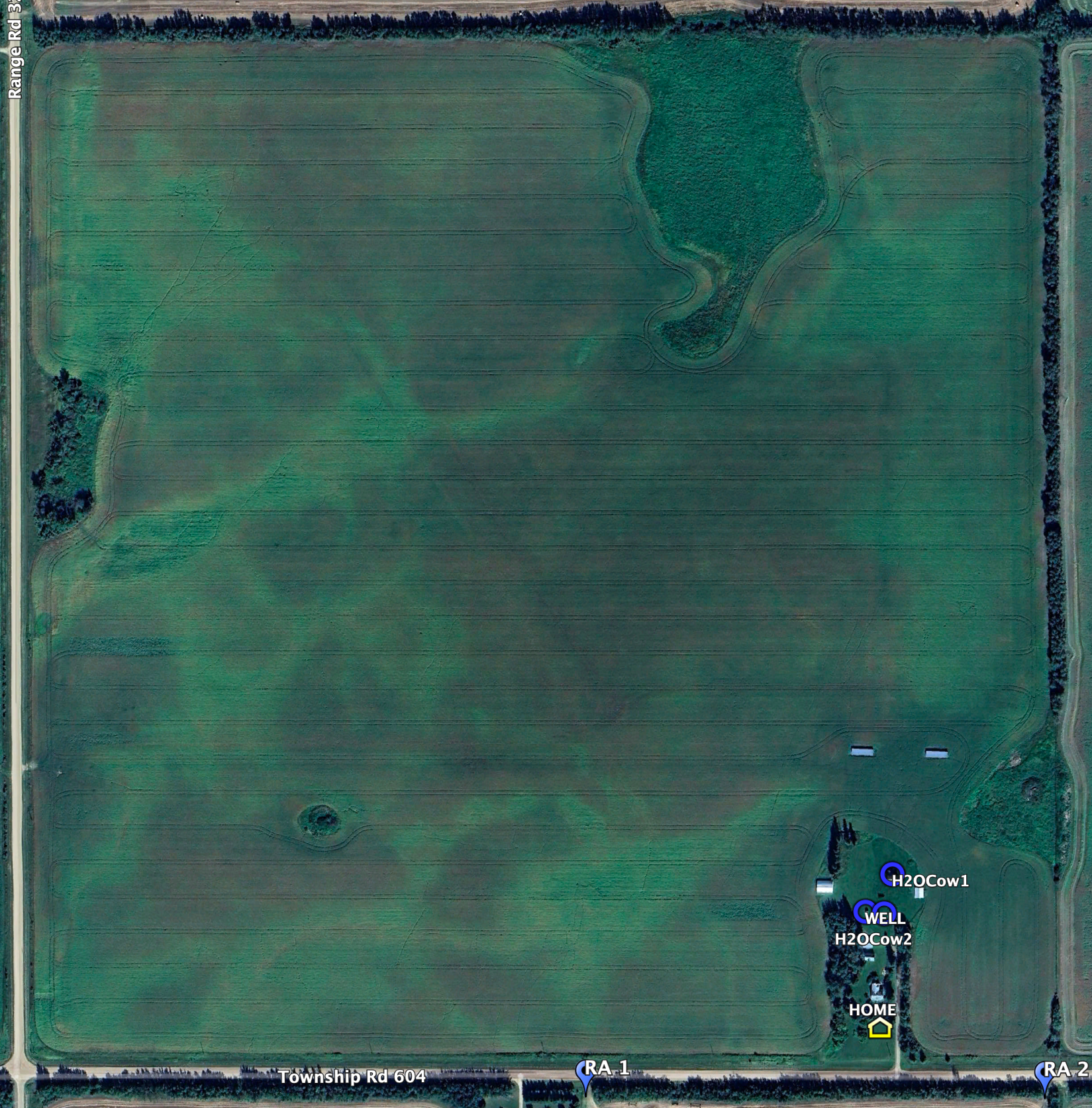 There is an acreage of 3 acres near the southeast corner of this quarter, which is the original home site for the home quarter and south quarter, and will be used as a home base for the grazing plan, particularly for water. It contains a well used for the house and for two main cattle waterers, as shown on the maps above, which are currently capped (but can be uncapped for future use).