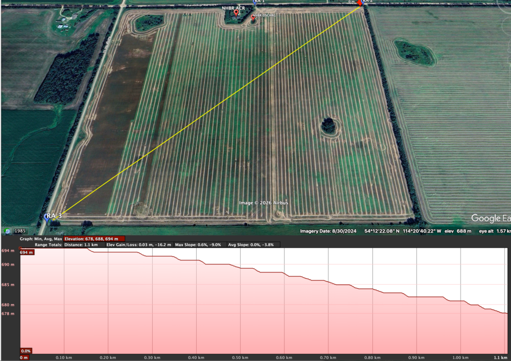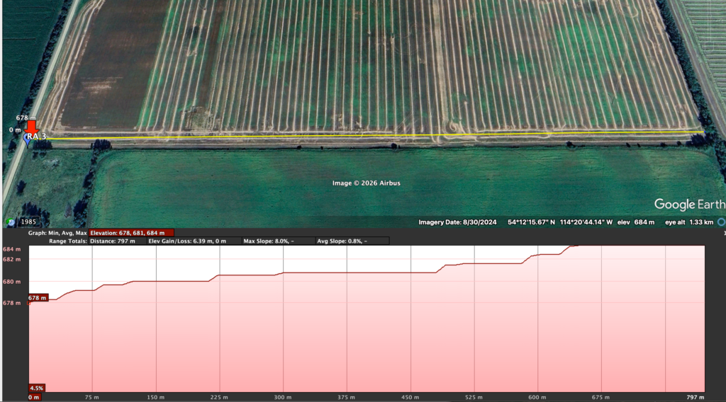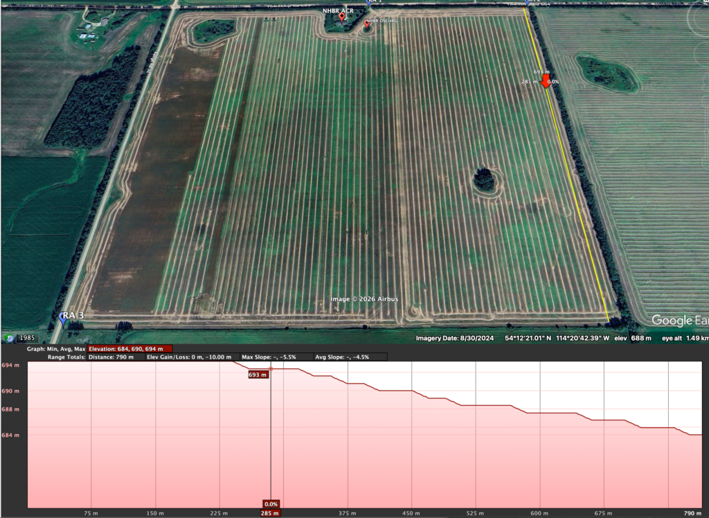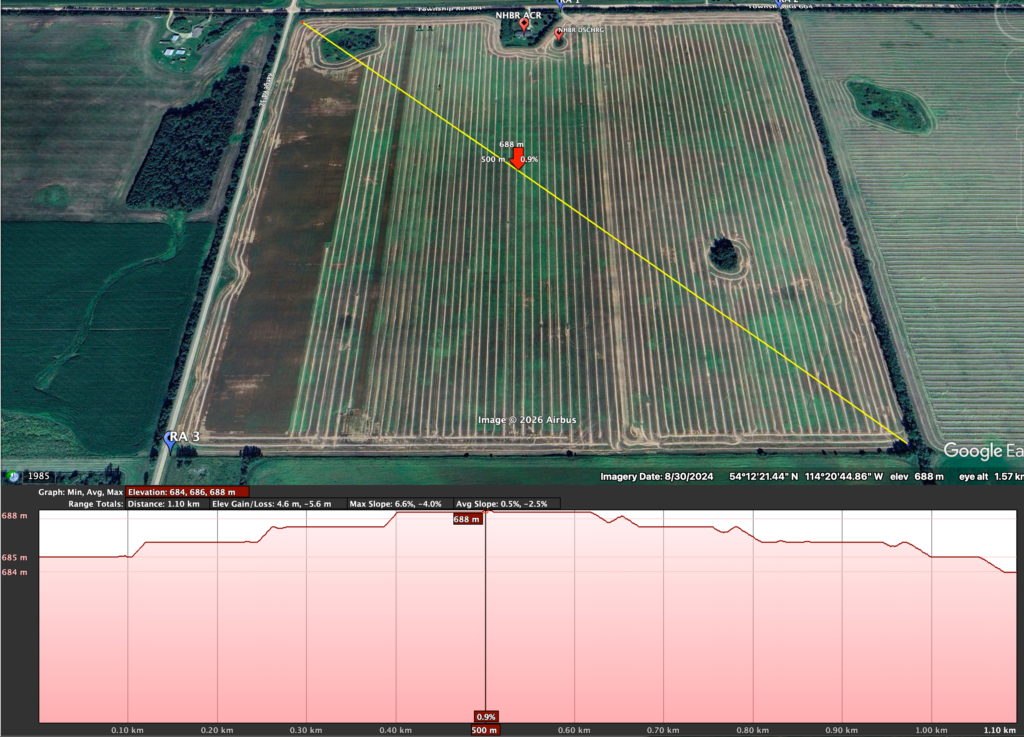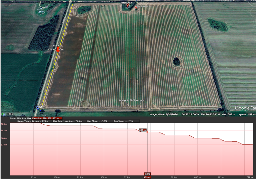 The highest point[s] is at the southeast corner, and up towards the northeast corner, with an elevation drop of only 2 metres. However, when venturing westward, the elevation decreases significantly, with the lowest at the southwest corner and the next-lowest at the northwest corner. Some undulation in the landscape created random areas where water accumulates during significant rainfall events or snowmelt. These areas are visible not only in satellite imagery but also when walking the land.