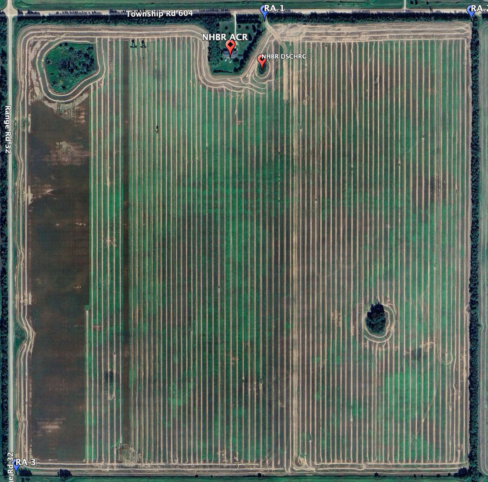 There are about 2 acres of land owned by neighbours, near the northern edge of this quarter. They have a sewer pump that is about 30 feet from their property fenceline, which must be respected. A county road runs along the northern edge and the western edge of the quarter section, and neighbours’ fields exist to the east and south. There are three primary road approach points: one at the northeast corner, one just to the east of the neighbour’s property, and the third at the southwest corner. The most commonly used approaches are the two at the north edge of the quarter.