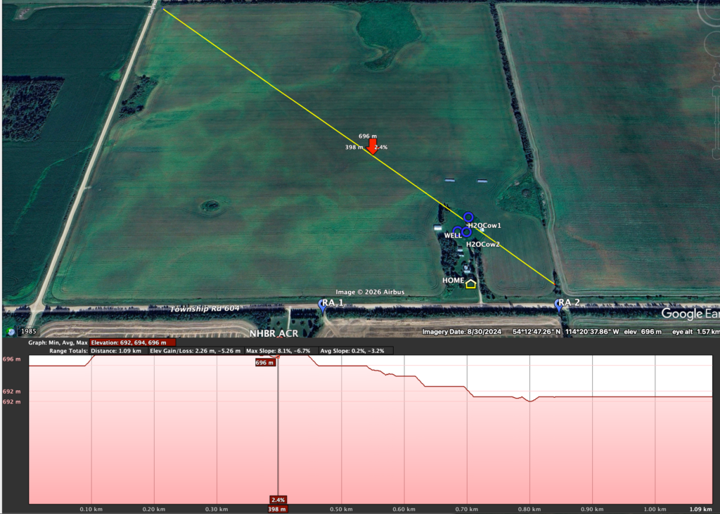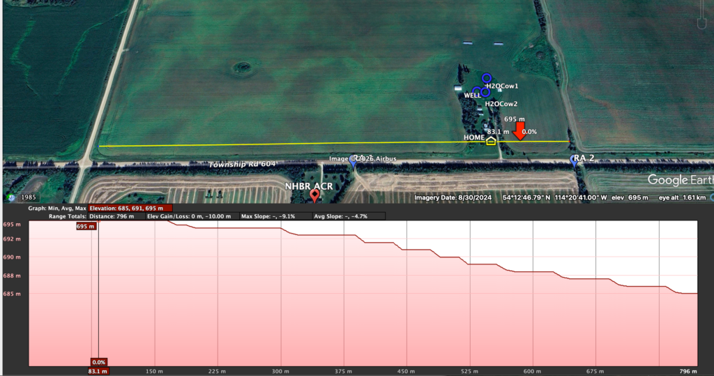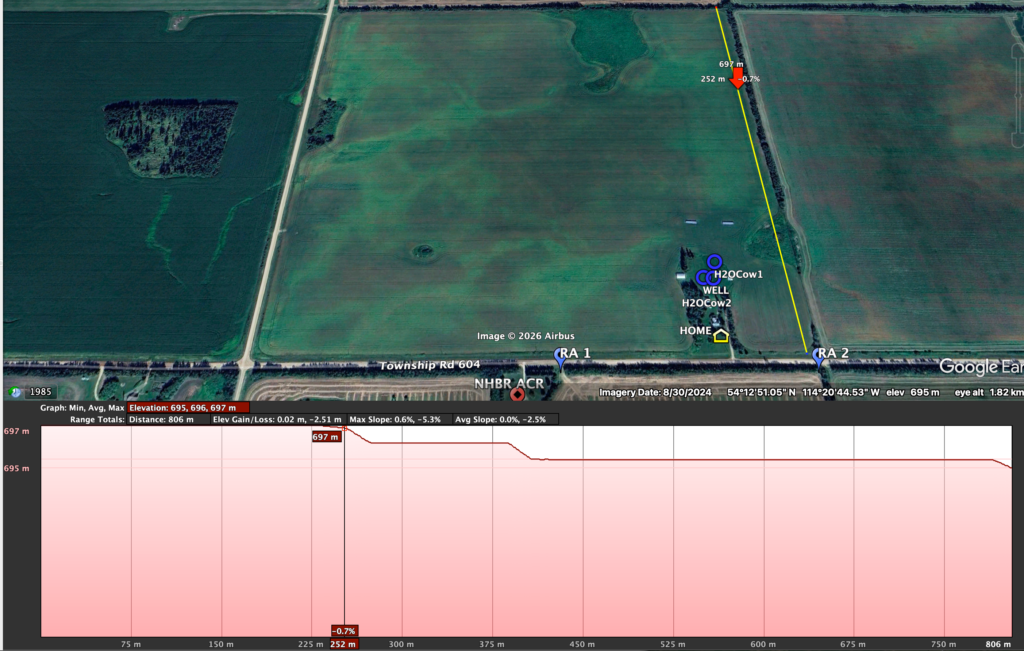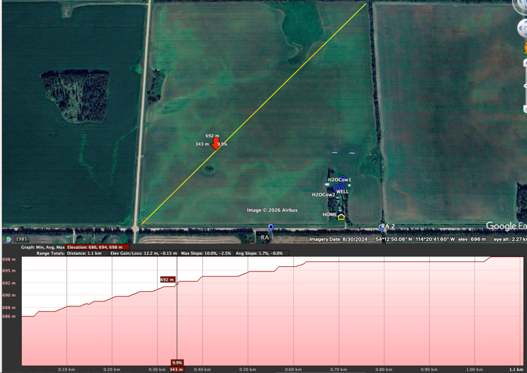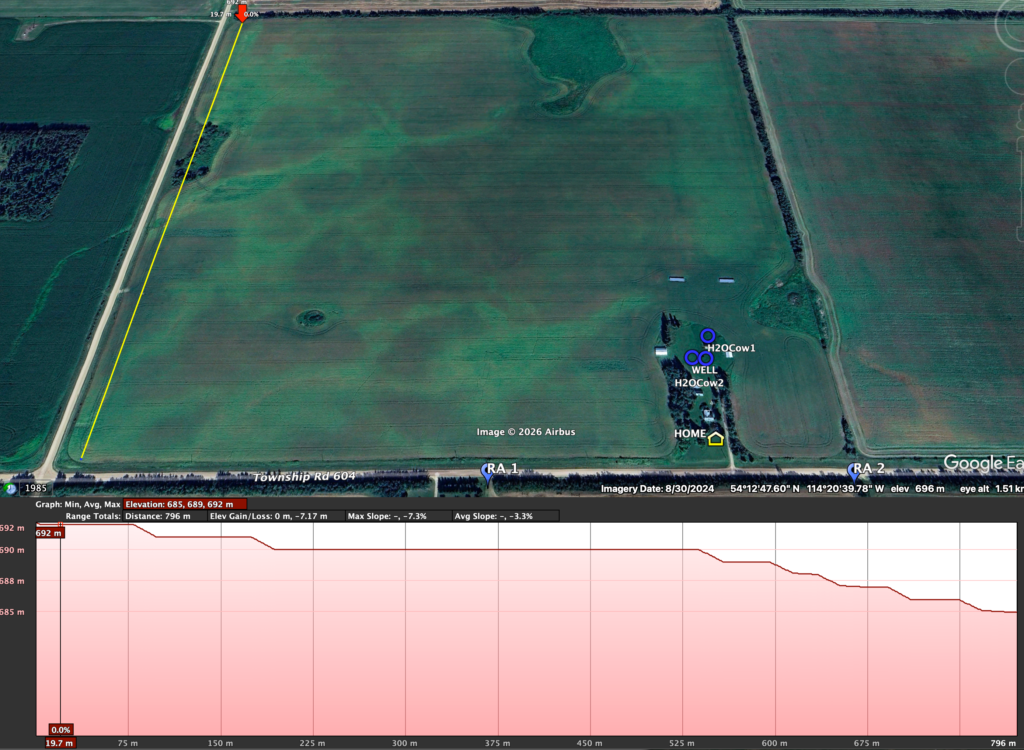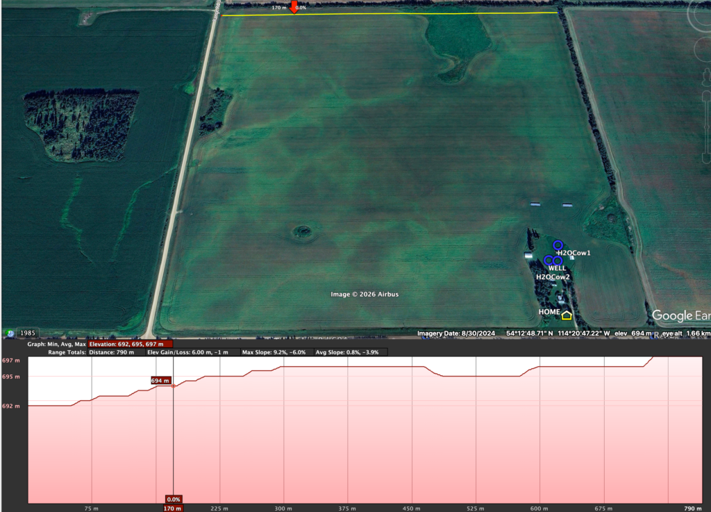 I’m also open to different types of plans; I’m not opposed to having lanes, getting cattle to a central water source, using mobile waterers, or multiple water stations supplied by temporary waterlines. (I will provide multiple plans to showcase the different choices I have to choose from on my landbase. Note that this may be much different for your context.) However, because I’m grazing so many animals (more than Dad did, which was a maximum of 60 to 70 head of stocker steers on 100 acres of just one quarter section over ~160 days), I want to make the water source issue a bit easy for the animals so that 1) they don’t have to travel a maximum of half a mile for water, and often all at once, and 2) trampling and cow-trail making is minimal.