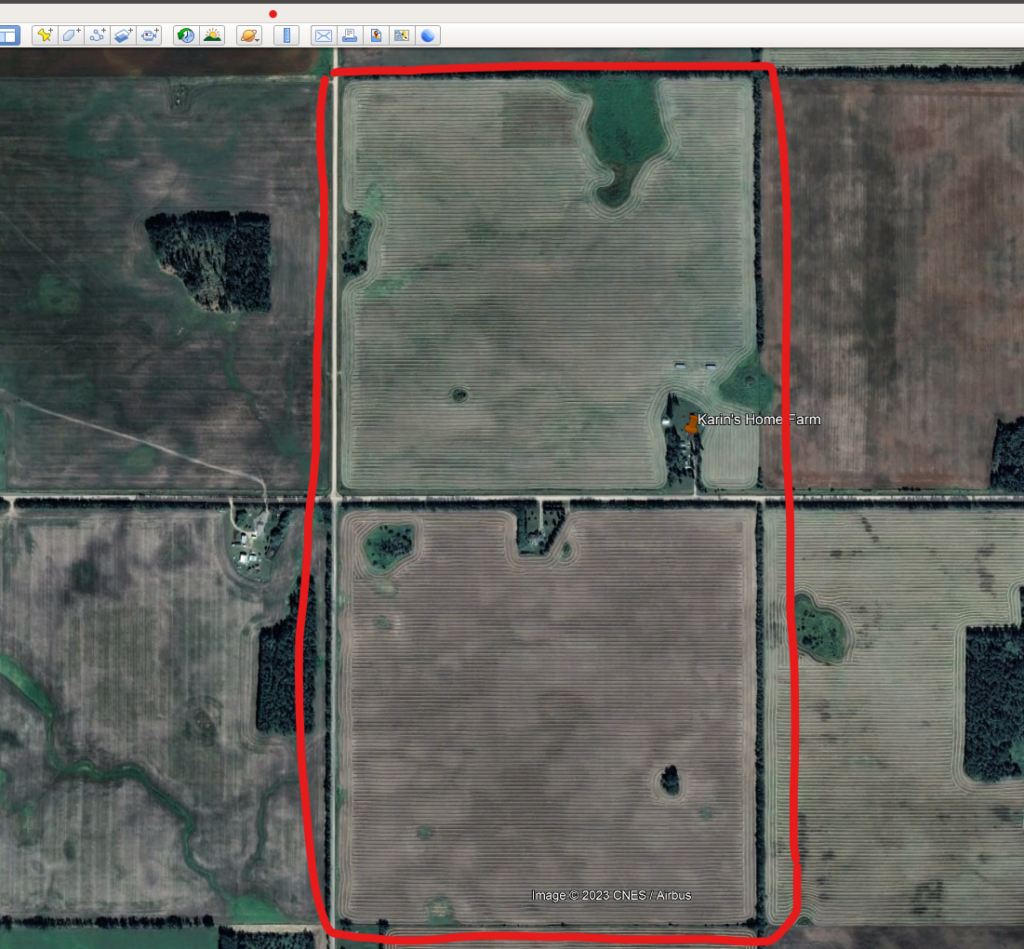 Finally, the entire quarter is in annual crop production. Its previous crops have been wheat and canola. Years ago, it grew a great hay crop on one-third of the area (~60 acres), but that, too, was plowed under to produce cash crops.
